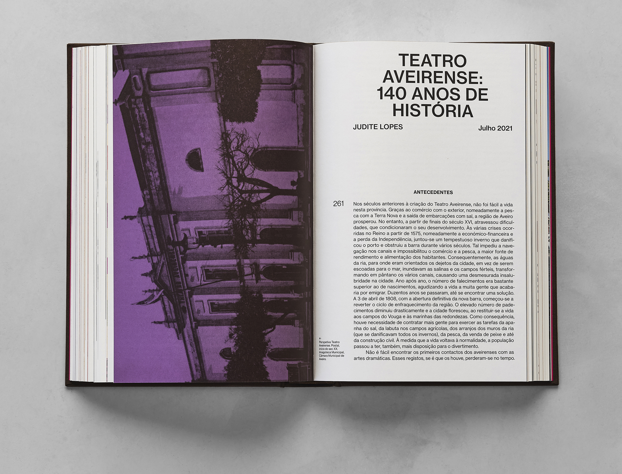 This book is part of a multi-faceted project commemorating one hundred and forty years of the Teatro Aveirense (Aveiro Municipal Theatre). The other parts of the project are an exhibition, and a new graphic identity.