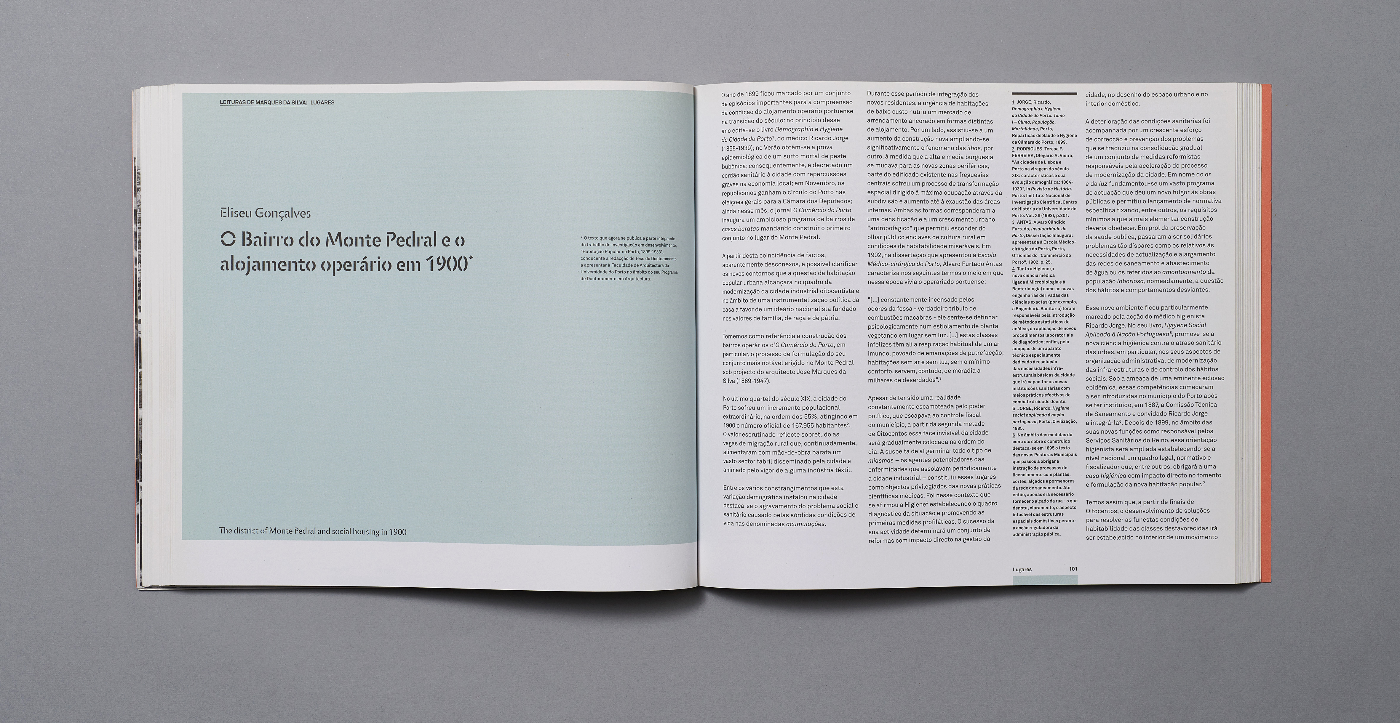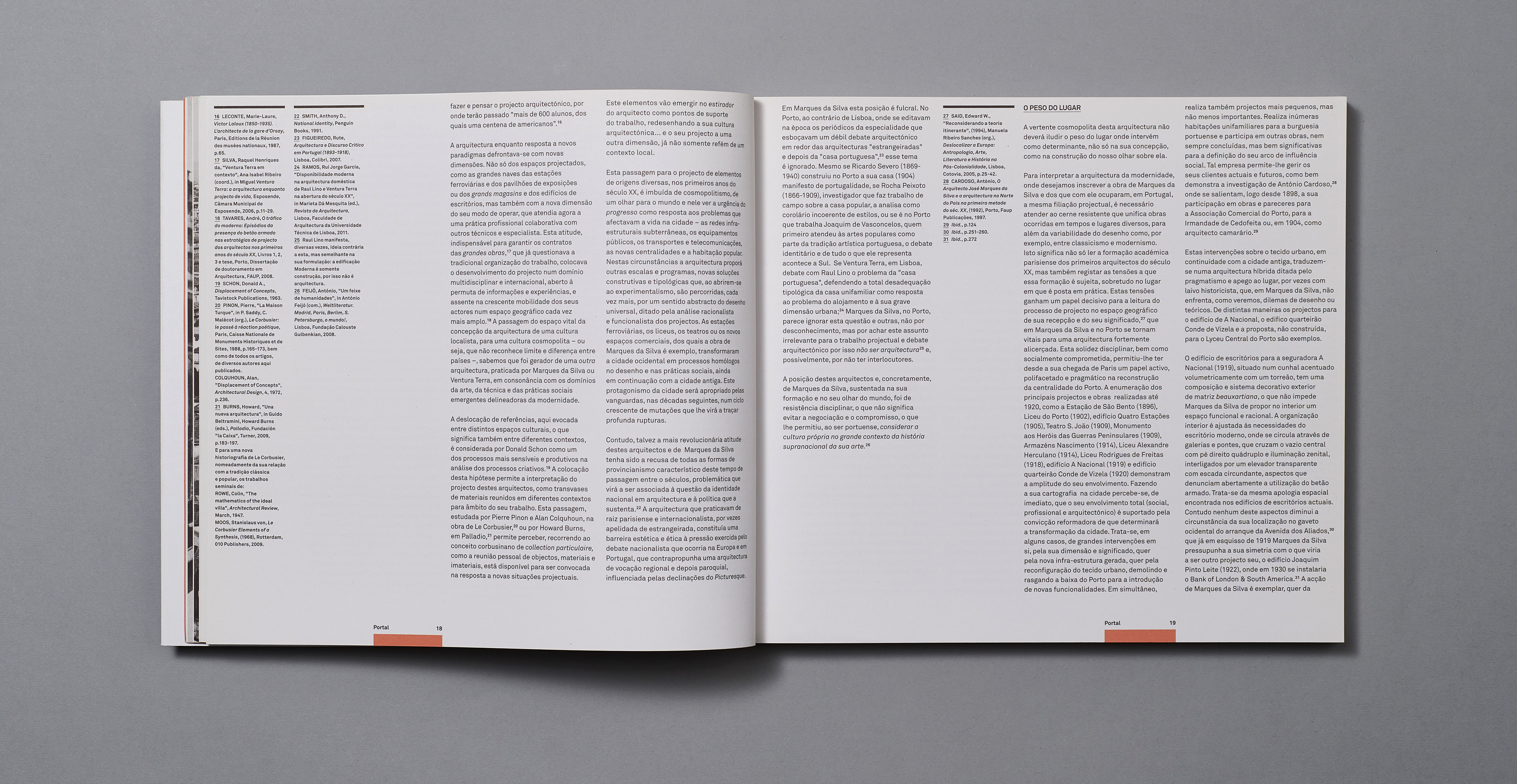 This complex book took 6 months to design. Following the Conference 'Recoonstuir Cidades; Cartografias a Partir de Marquea da Silva' which took place in 2009 (and for which we designed the graphic materials), the studio was originally asked to reproduce the conference papers in the form of a pdf to be made available on the Foundation website. This request later transformed into a request to design a book – a very different proposition. A very detailed but flexible grid was designed to be able to control the text image relationship. A general rule was established whereby images would run in the top section of the pages and exceptions were dealt with individually. Part of the adventure in the design of this book was to push the grid to it's limits with regard to the margins. For the cover design, an historic photo of Porto, printed on the reverse of the cover flap, is visible behind the cut-out letters of the title, reflecting a concept of being able to see the city through Marques da Silva.