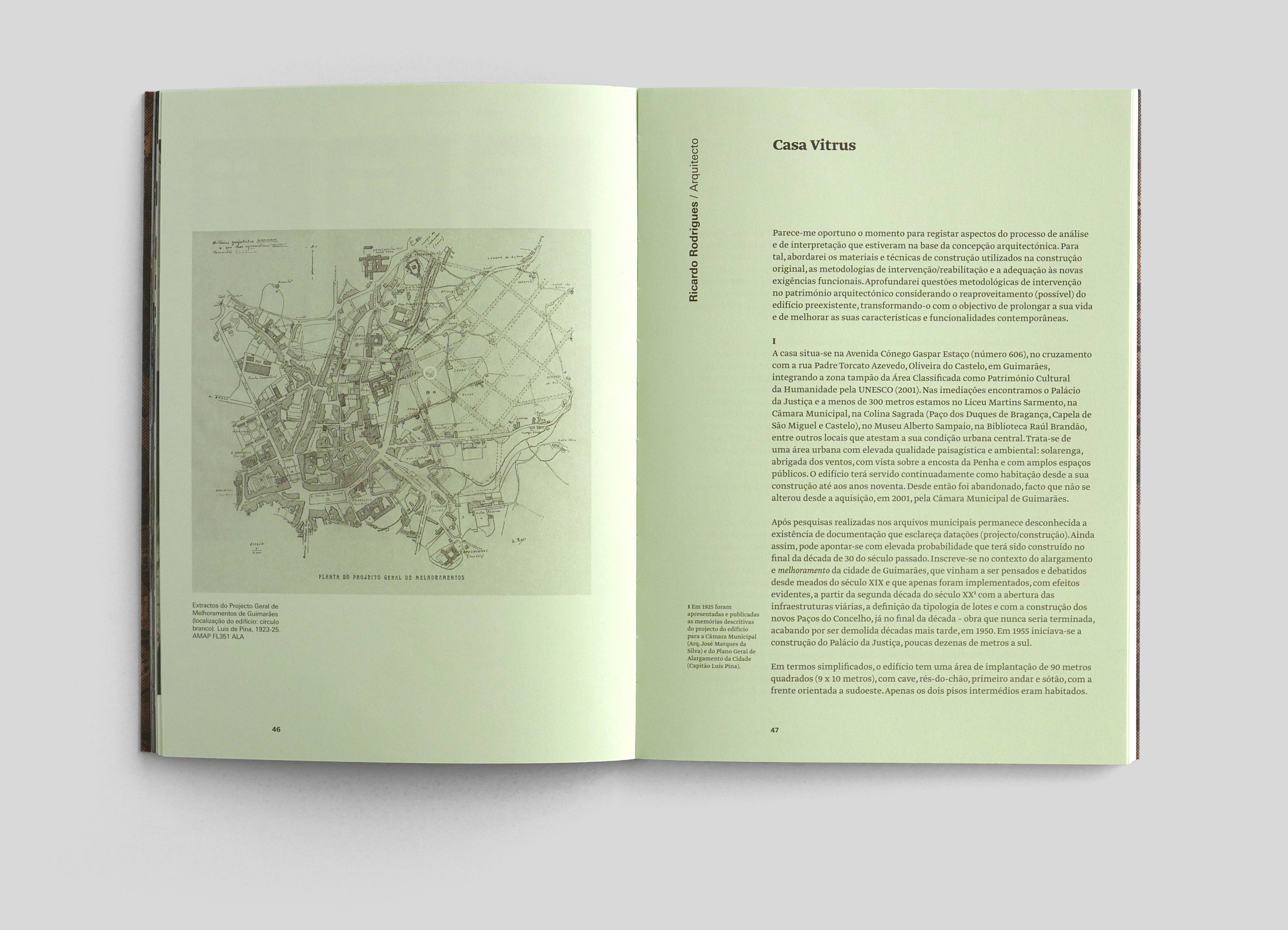A book about the renovation, by architect Ricardo Rodrigues, of a property in the city of Guimarães. The text section, printed on coloured paper, sits between two photo sections – the first showing the original building and the process of renovation, and the second showing the finished house.