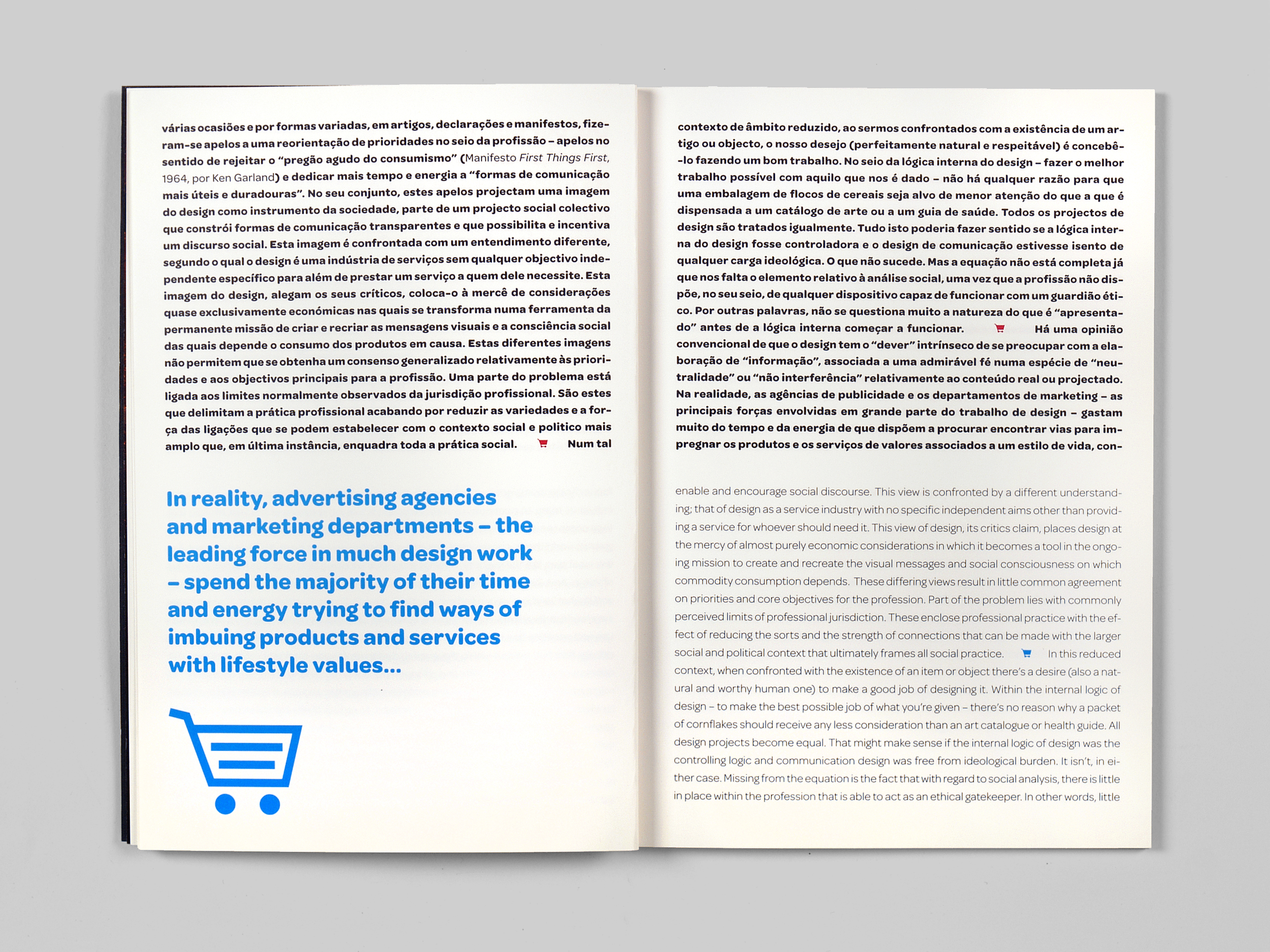 The location of the exhibition space itself creates a particular challenge – that of interrupting and diverting, if only momentarily, the normal routines of shopping, eating and going to the cinema. Added to this is that despite the thriving and growing design community in Porto, indeed in Portugal, there are virtually no designated design venues in the country, and exhibitions that focus on graphic design are few and far between. With this mixed context in mind the Idioms series attempts to accommodate two different types of audience: on the one hand some of the thousands of visitors that the centre attracts every day, many of whom are unlikely to visit museums and galleries of art with any frequency, if at all, and on the other, a specialised audience of designers and students whose interest and enthusiasm is already active.
