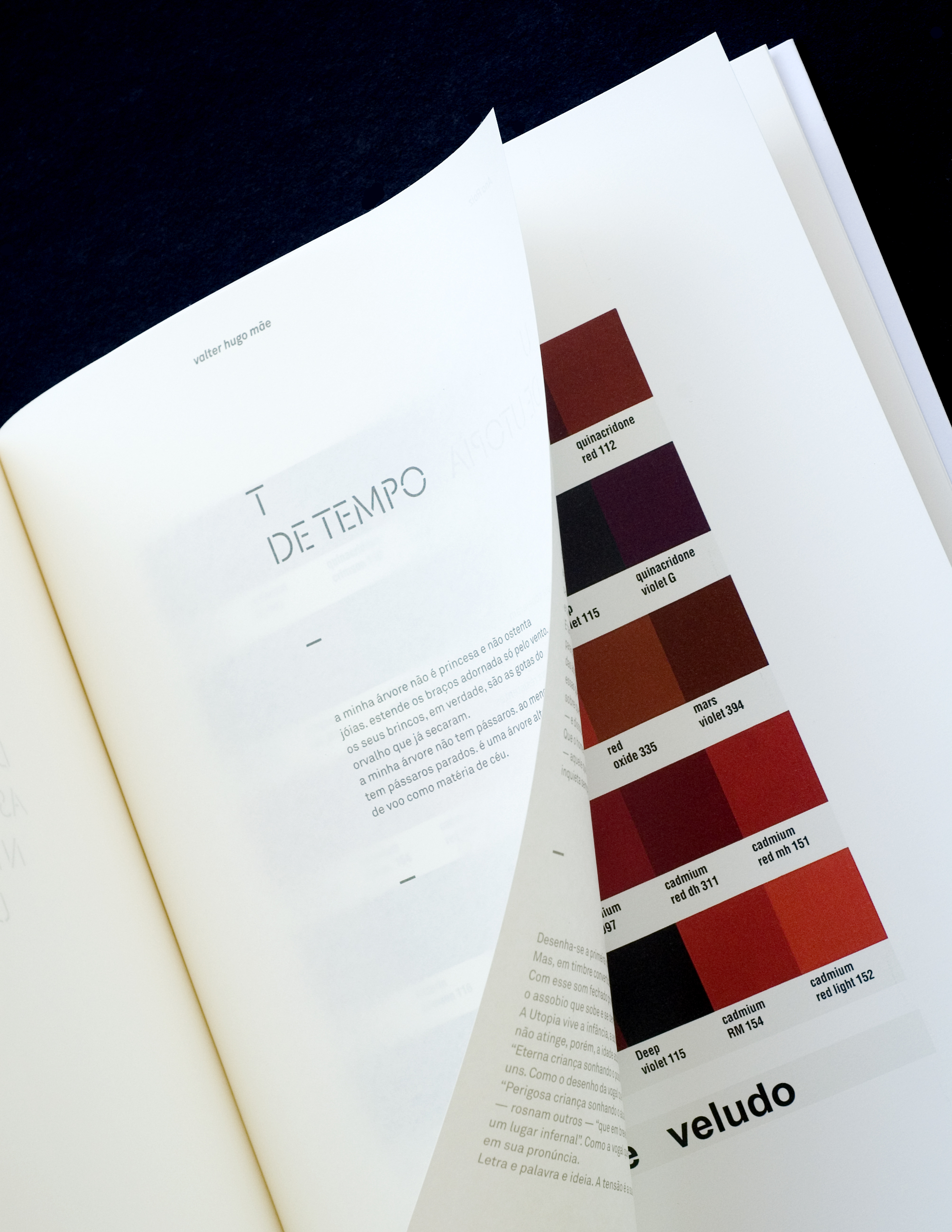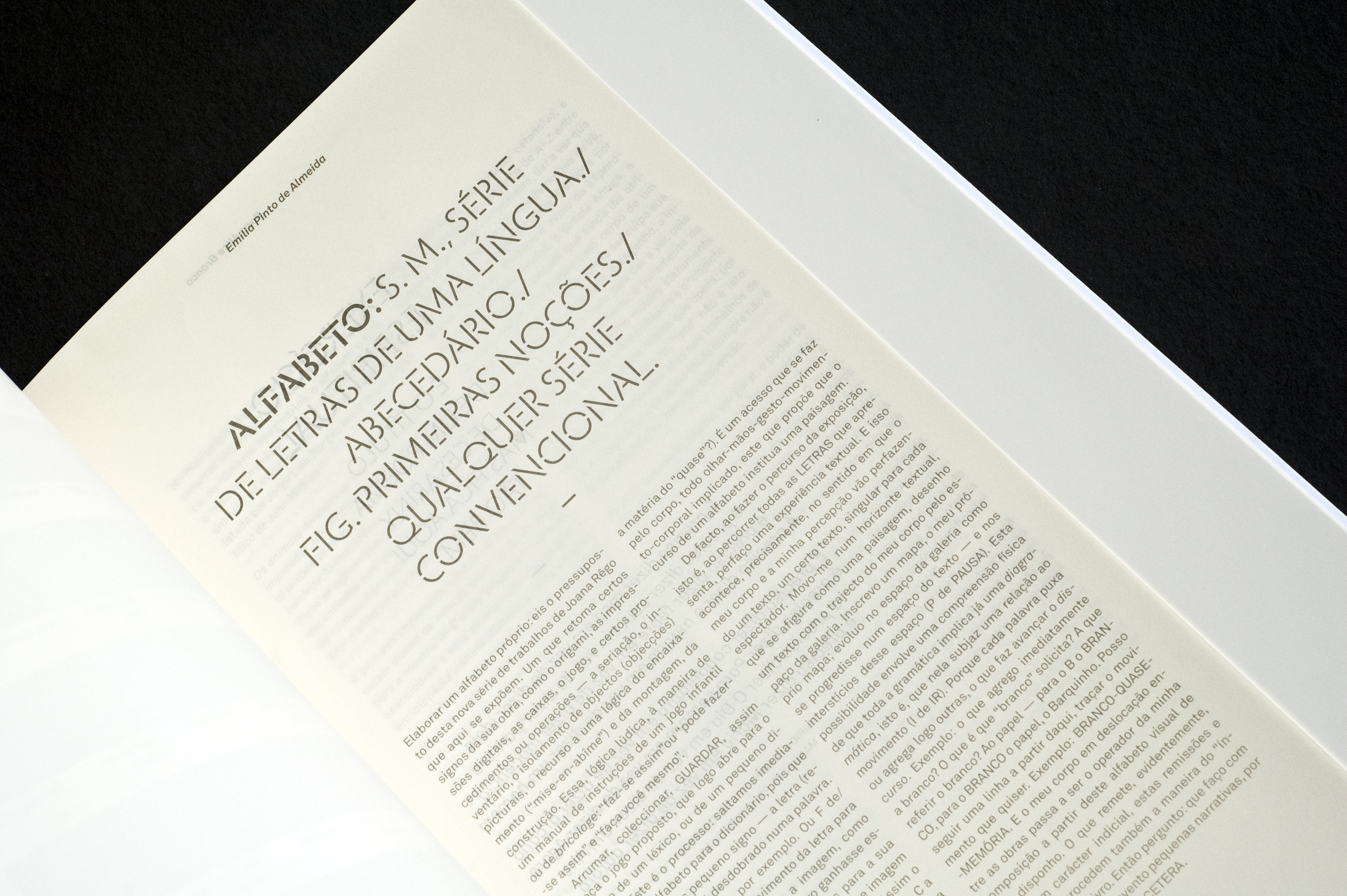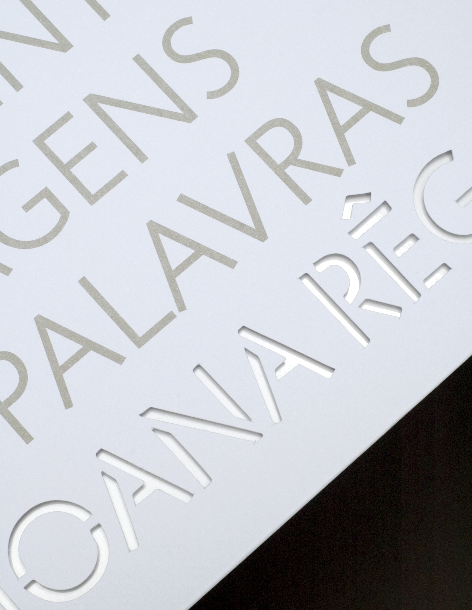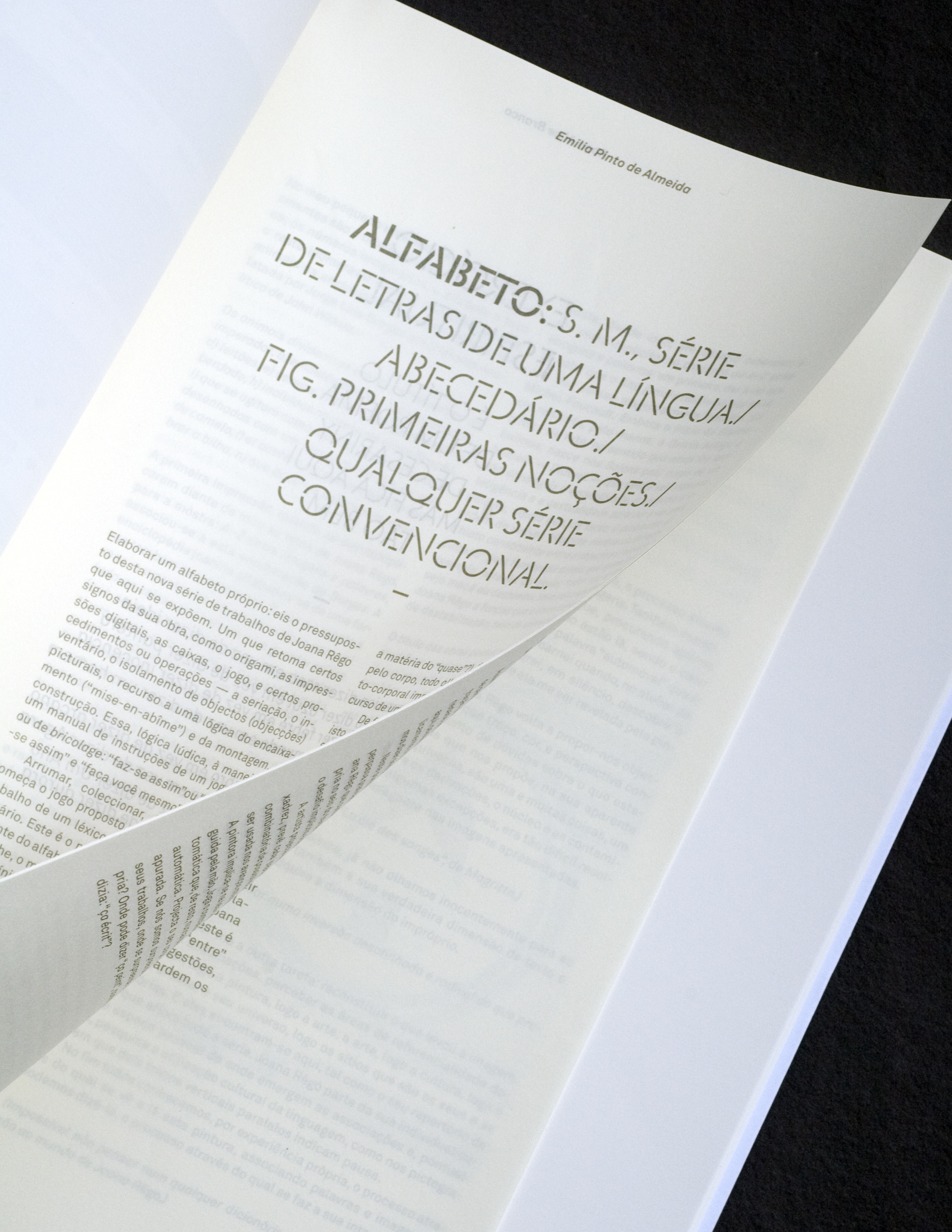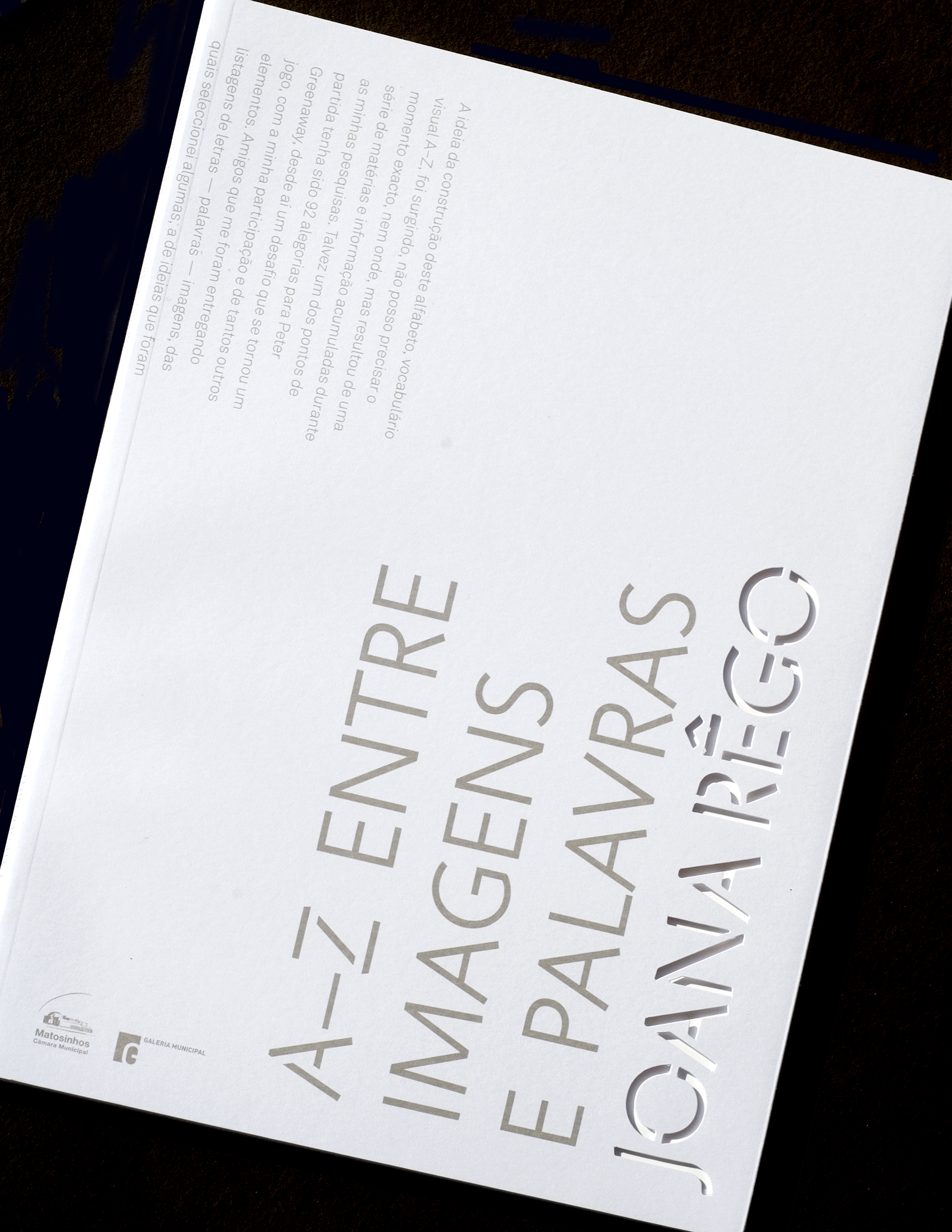 The Câmara de Matosinhos (Matosinhos City Hall) is the entity that creates the context for the public viewing of her work. It is the entity that both harbours and projects her work. The equivalent of such a function in a book is the cover. It is the element that envelopes the pages and provides the support for the binding. Consequently, the original idea was to place the texts of the Mayor and the Councillor for Culture on the front and back cover, wrapping around the catalogue. Sadly, this solution was rejected and instead, another text, by Joana herself, was used to perform this function on the front and back cover.