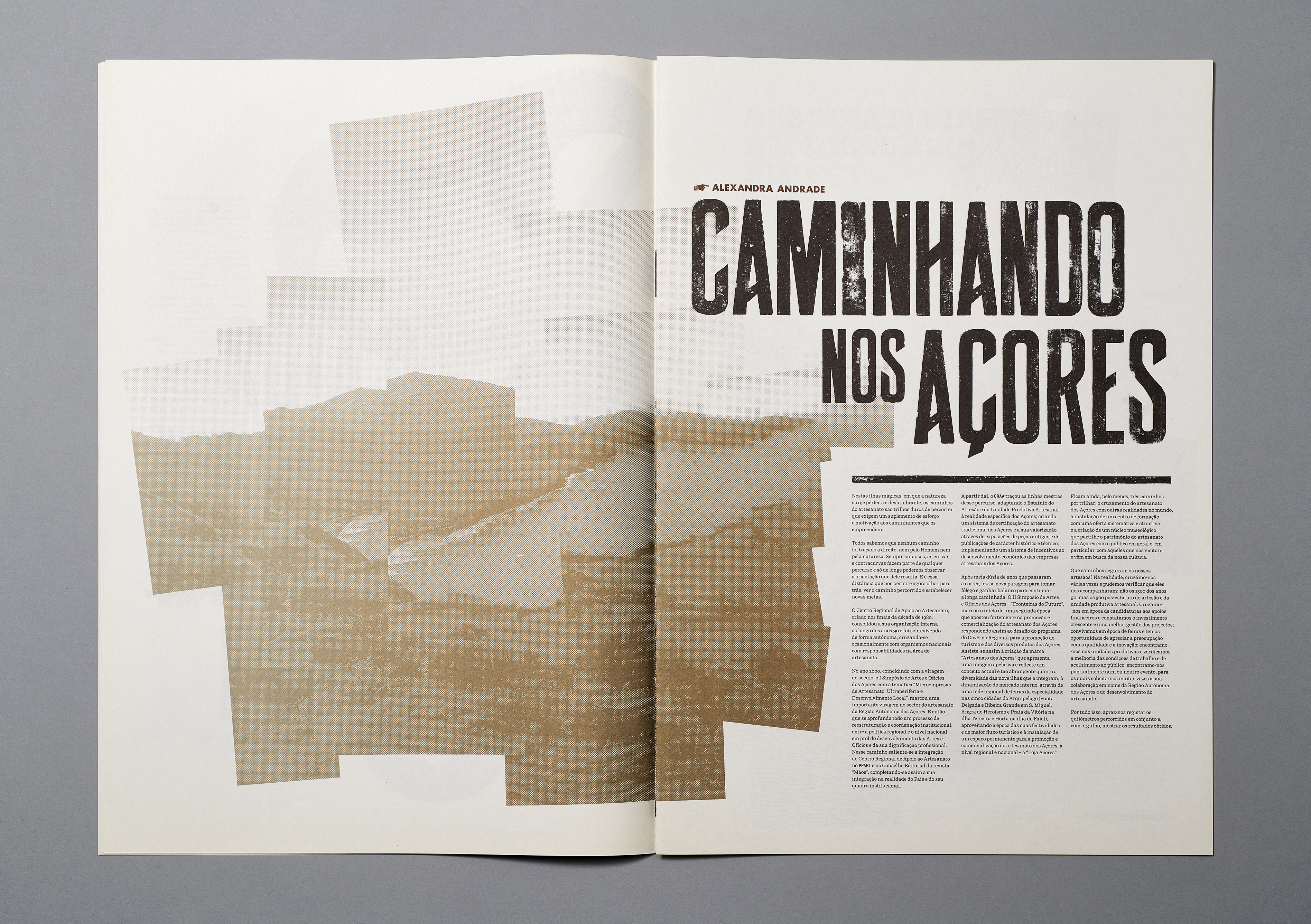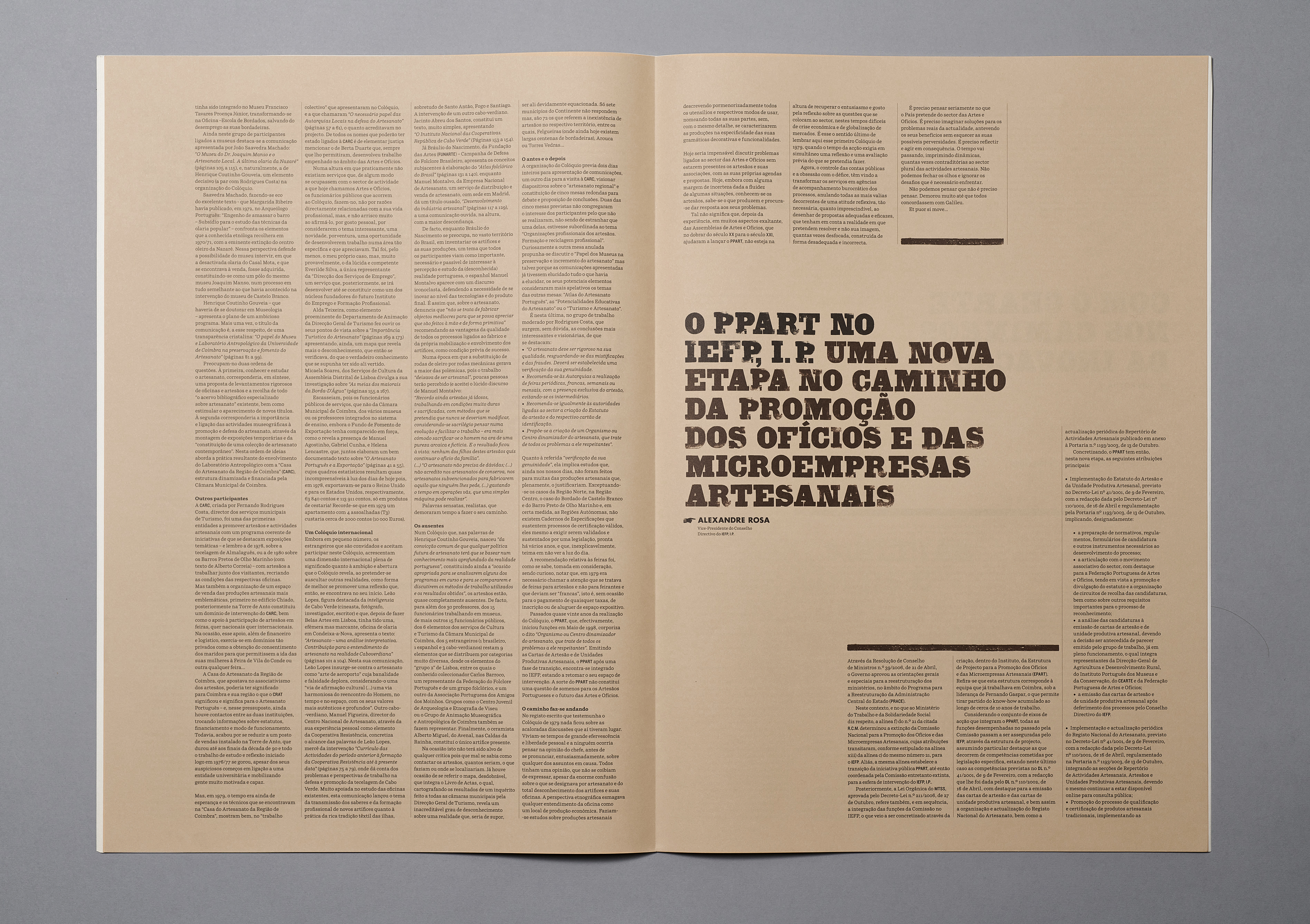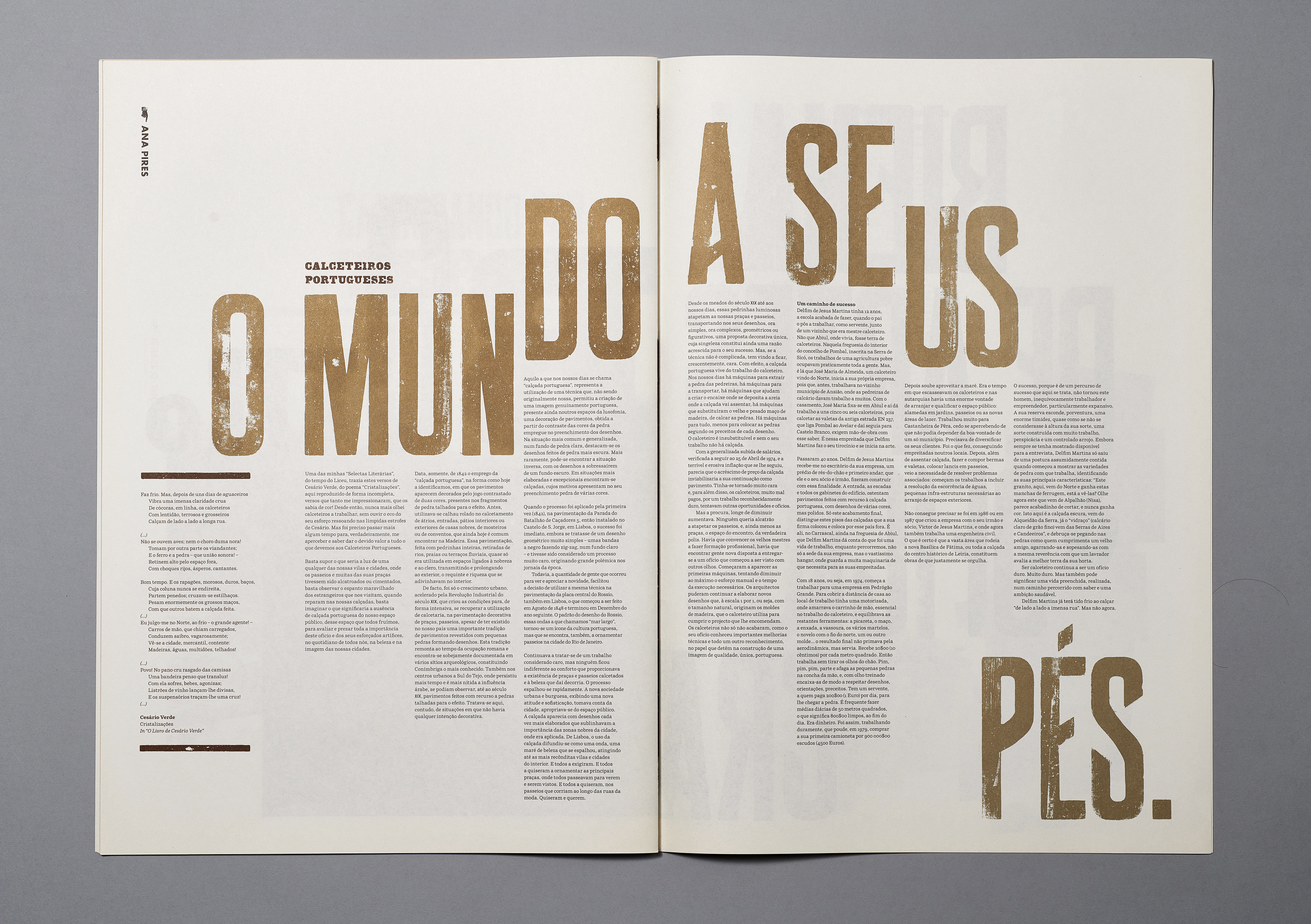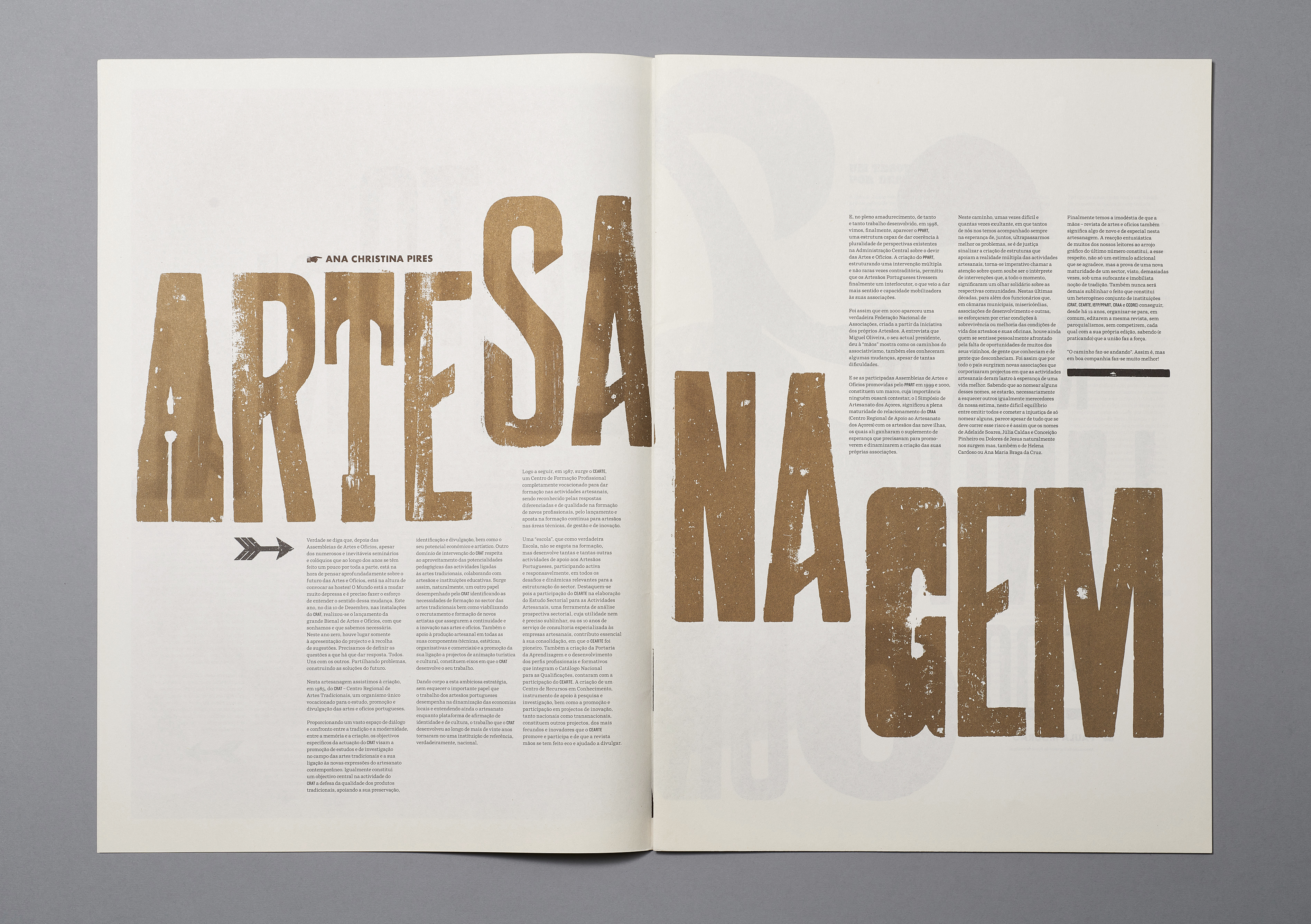 Considering the historic overview which this issue presents, we considered a newspaper format a most appropriate form; one which allowed us to handle large amounts of text in relation to a small amount of images. Always with craft in mind, and because newspapers are largely typographic compositions, we decided to explore the tradition of printed type. We visited the Museu da Imprensa (Press Museum) – to whom we would like to express our gratitude – in search of type examples from an era in which the form and use of type retained a tactile expression. We found what we were looking for and made original hand-inked prints on a manual press using large wooden type. These were subsequently scanned and we have used them for the titles and subtitles of this issue. Special attention was also made to the materials used. Although the design is visually expansive we have restricted both the colour palette and the sophistication of the paper and card is order to match the utilitarian nature of the publication.