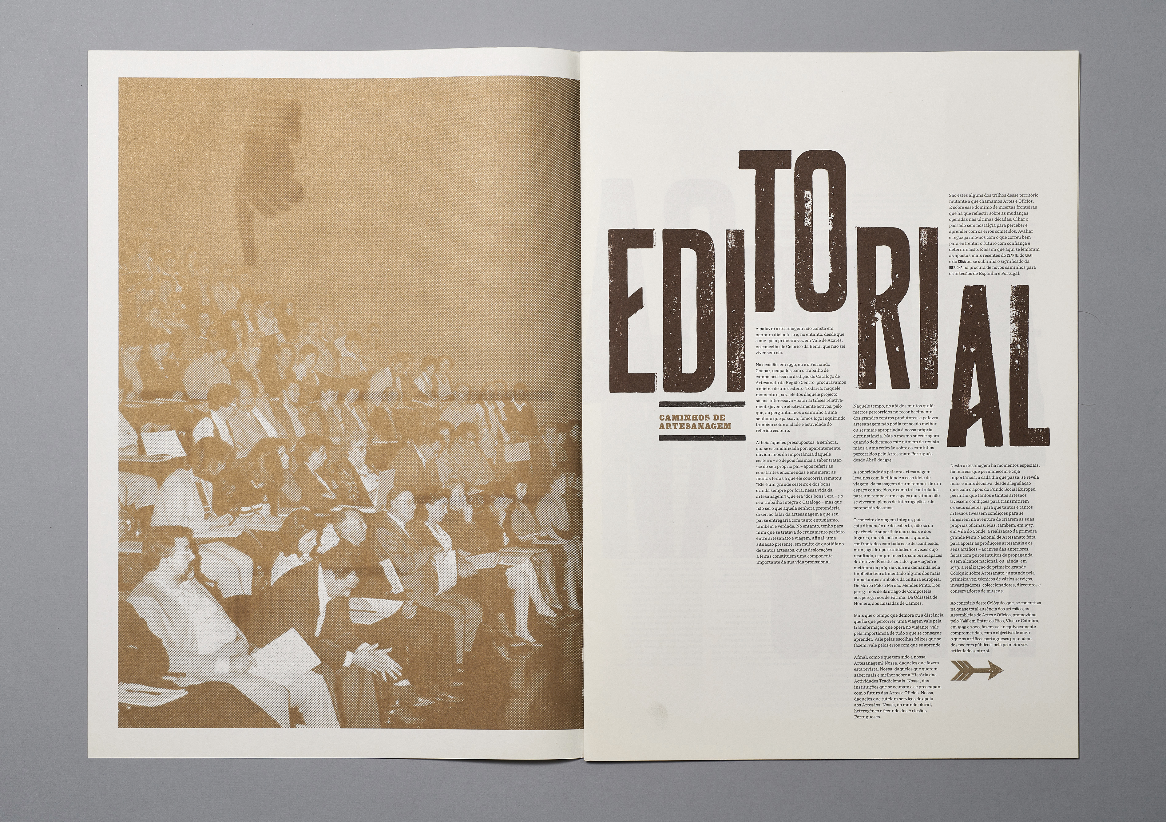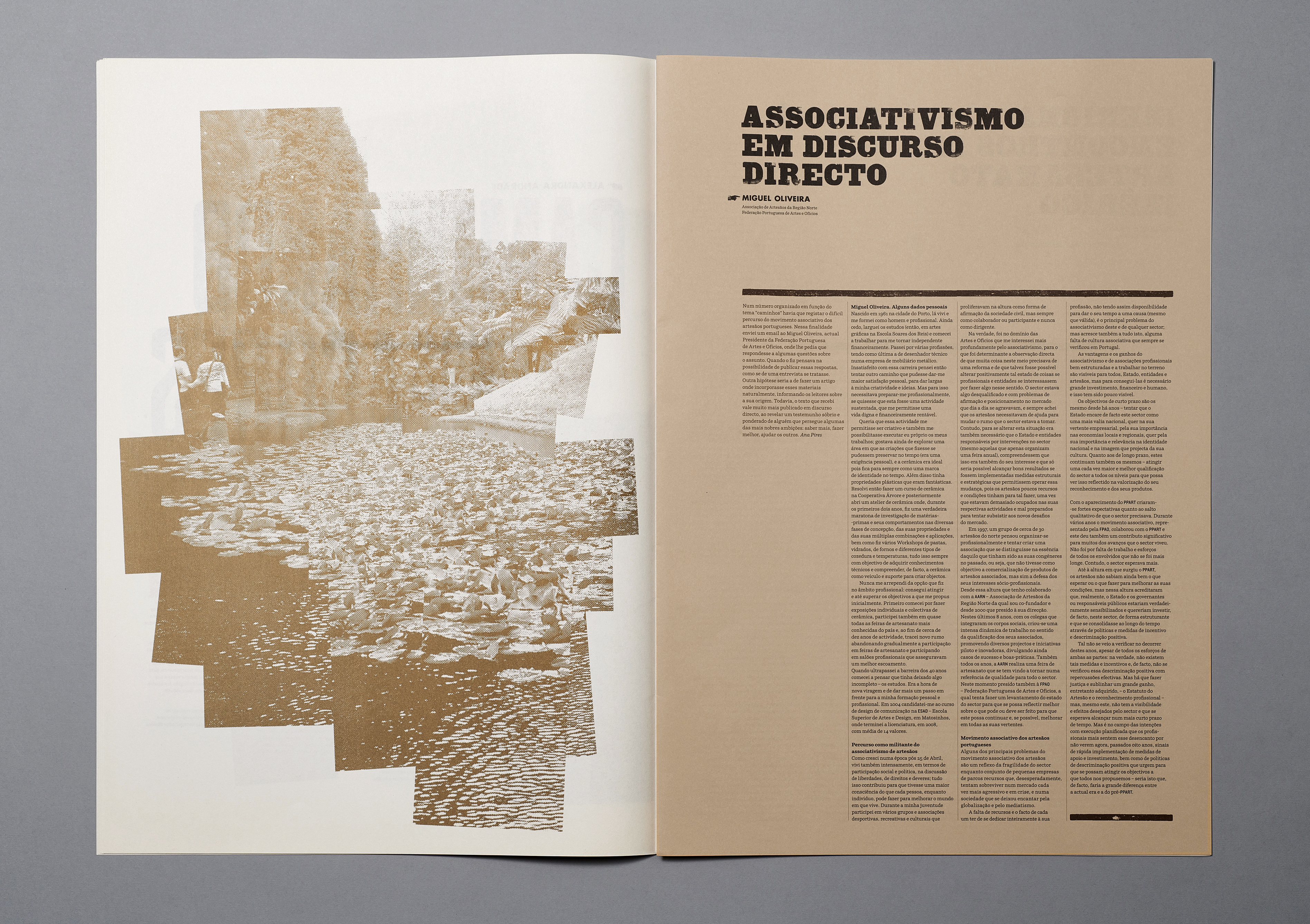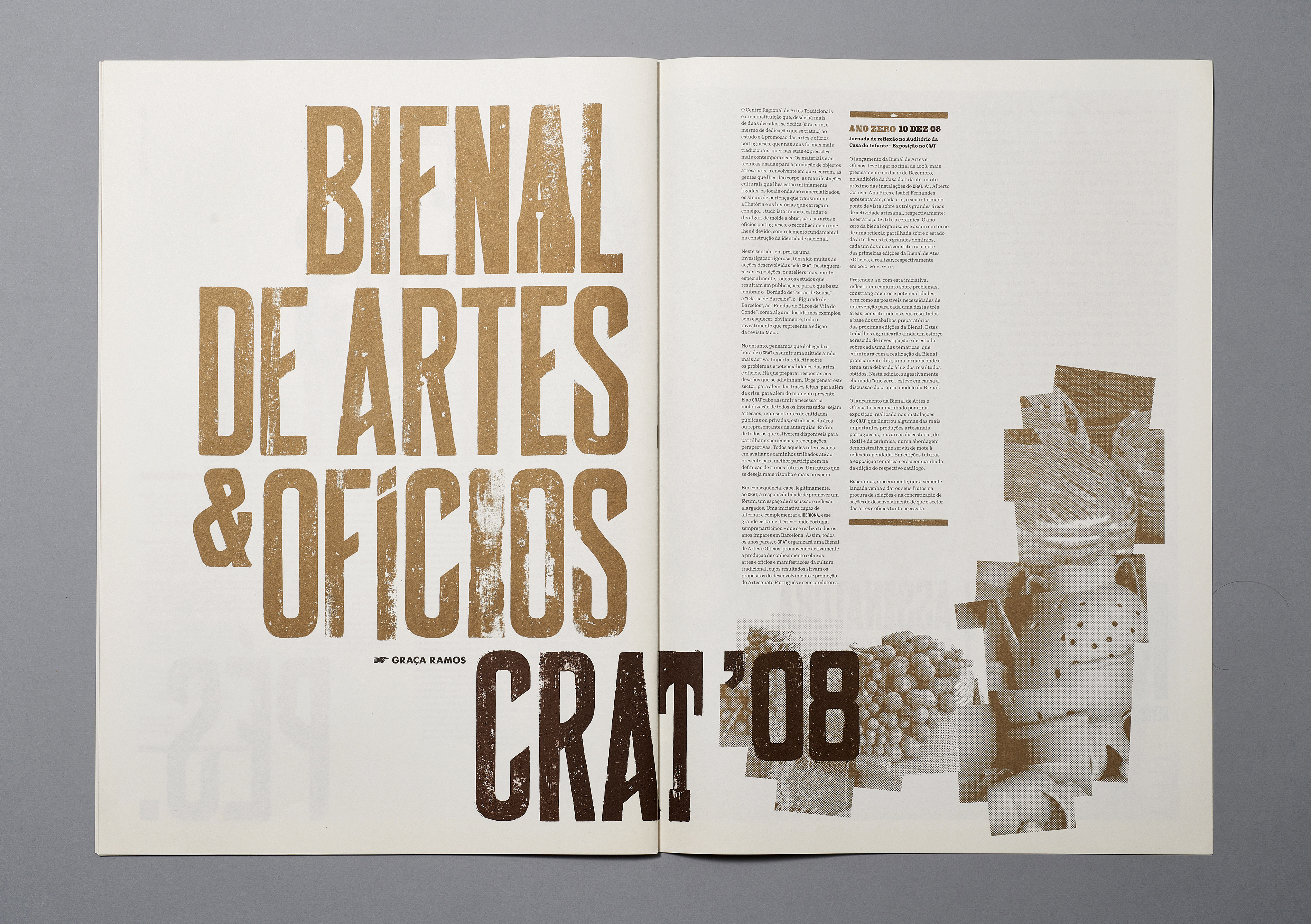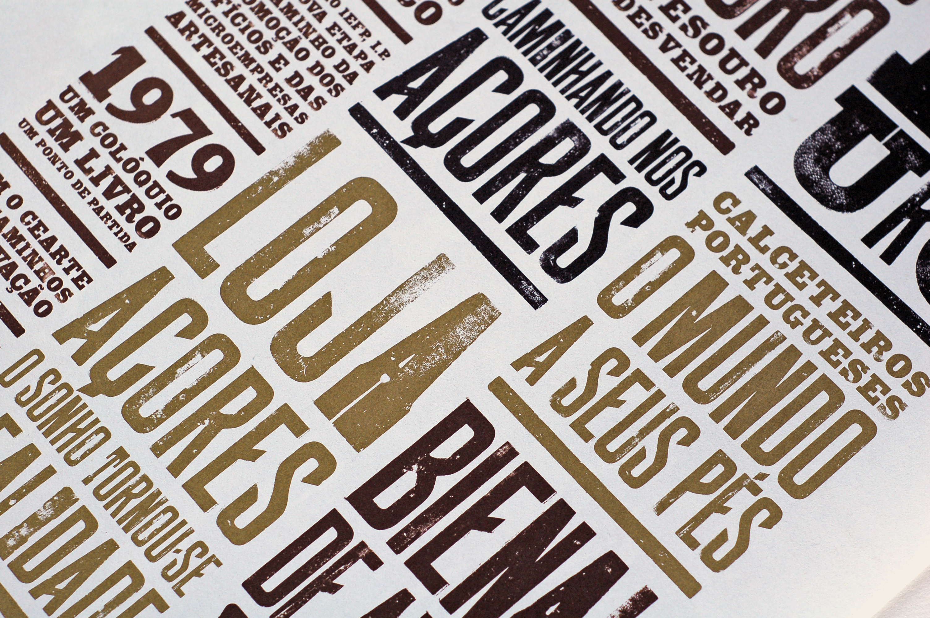 Considering the historic overview which this issue presents, we considered a newspaper format a most appropriate form; one which allowed us to handle large amounts of text in relation to a small amount of images. Always with craft in mind, and because newspapers are largely typographic compositions, we decided to explore the tradition of printed type. We visited the Museu da Imprensa (Press Museum) – to whom we would like to express our gratitude – in search of type examples from an era in which the form and use of type retained a tactile expression. We found what we were looking for and made original hand-inked prints on a manual press using large wooden type. These were subsequently scanned and we have used them for the titles and subtitles of this issue. Special attention was also made to the materials used. Although the design is visually expansive we have restricted both the colour palette and the sophistication of the paper and card is order to match the utilitarian nature of the publication.